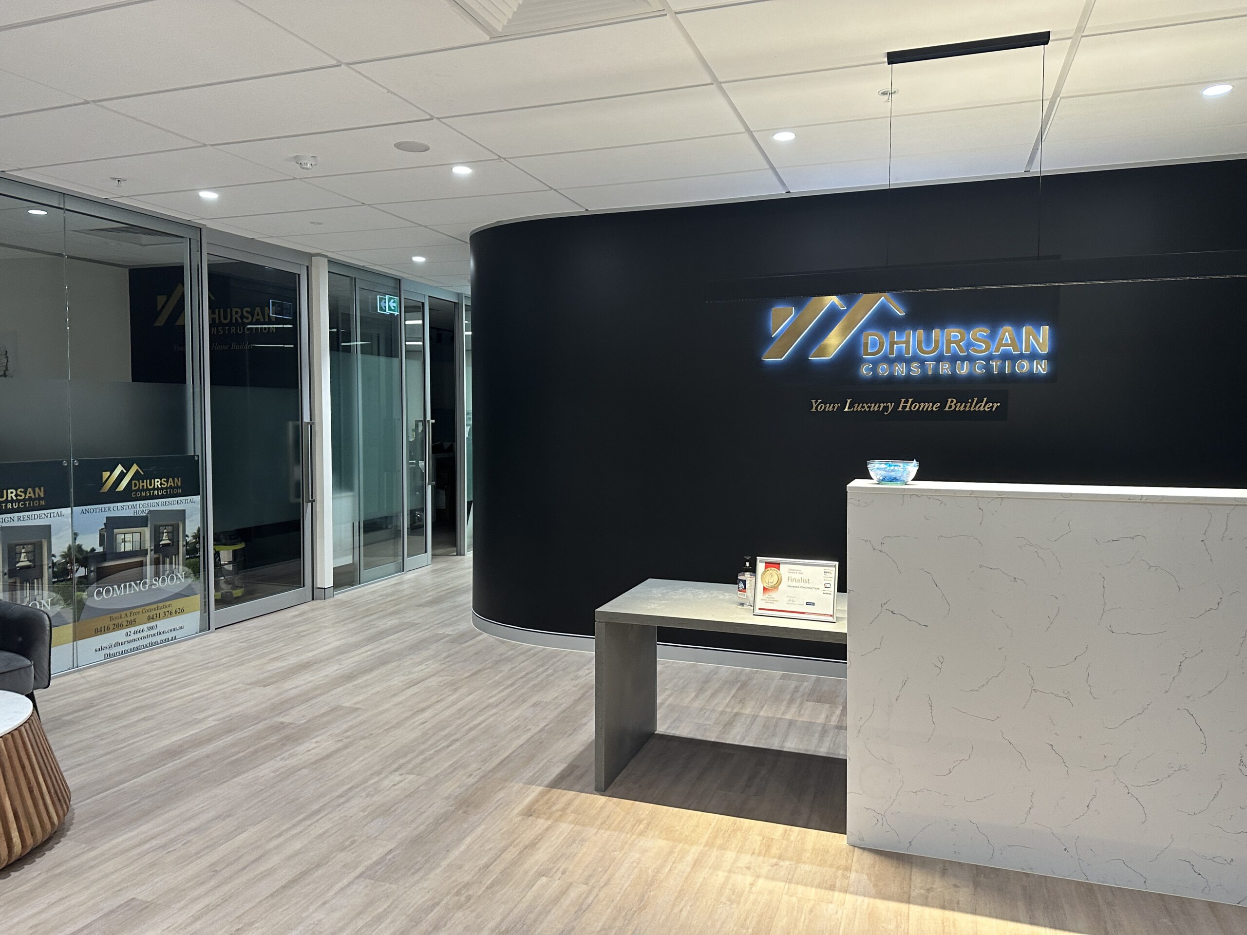 Interior fitout completed for Dhursan Construction’s Oran Park office, featuring glazed partitions, reception wall, and acoustic-ready layout.