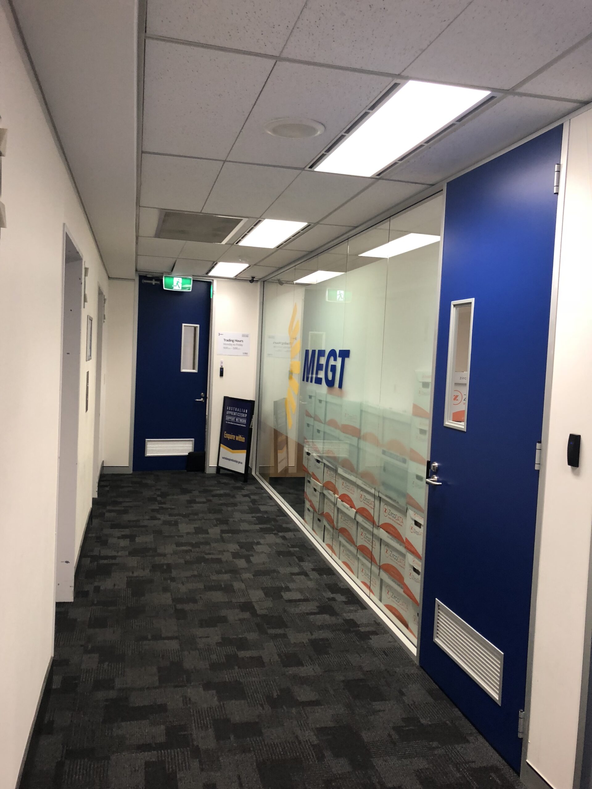 Office fitout completed for MEGT in Parramatta featuring new partitioning, workstation installation, cabling, and privacy enhancements.
