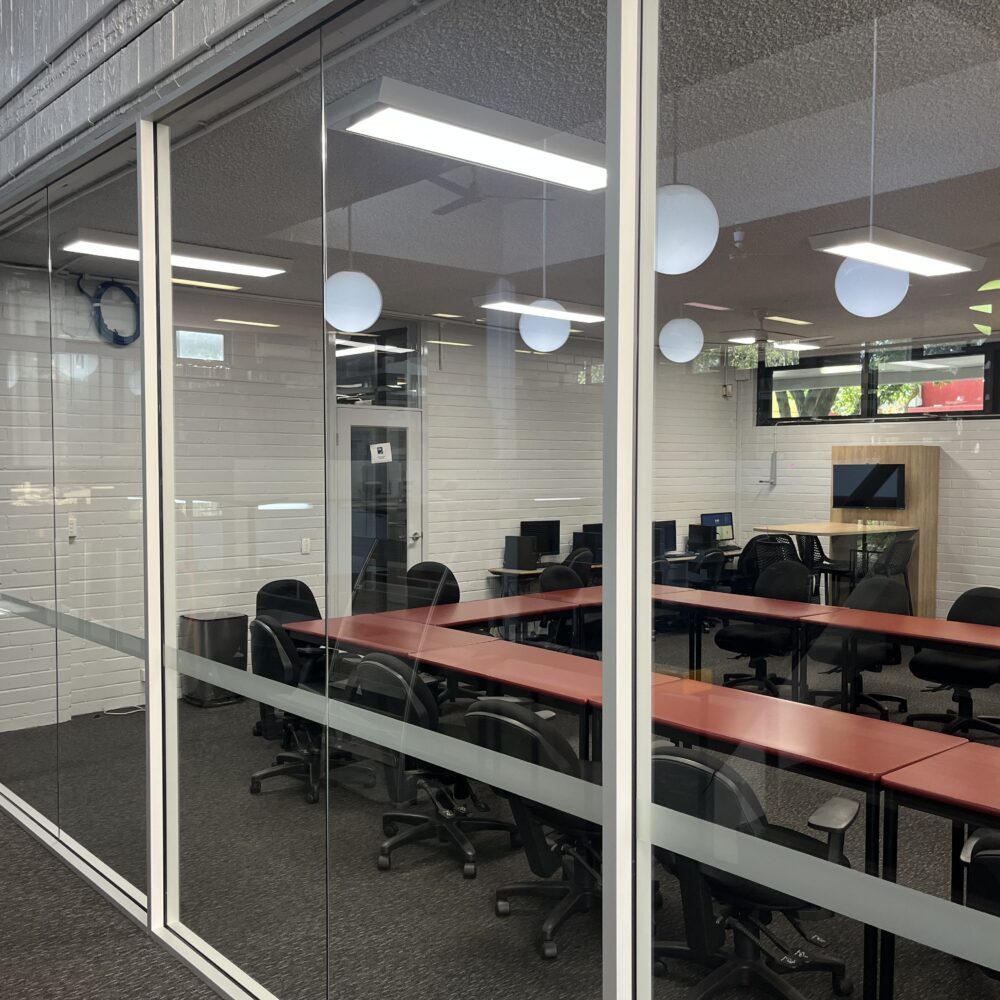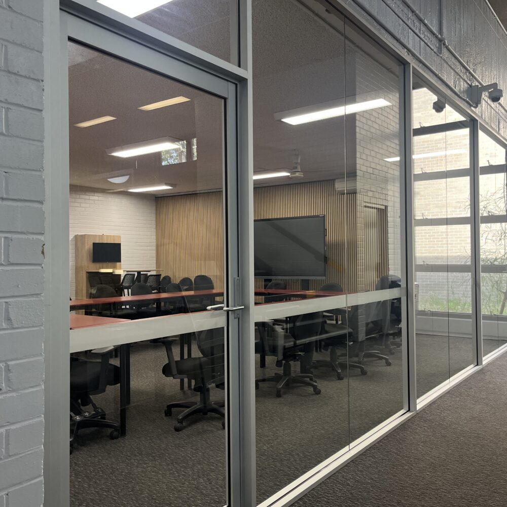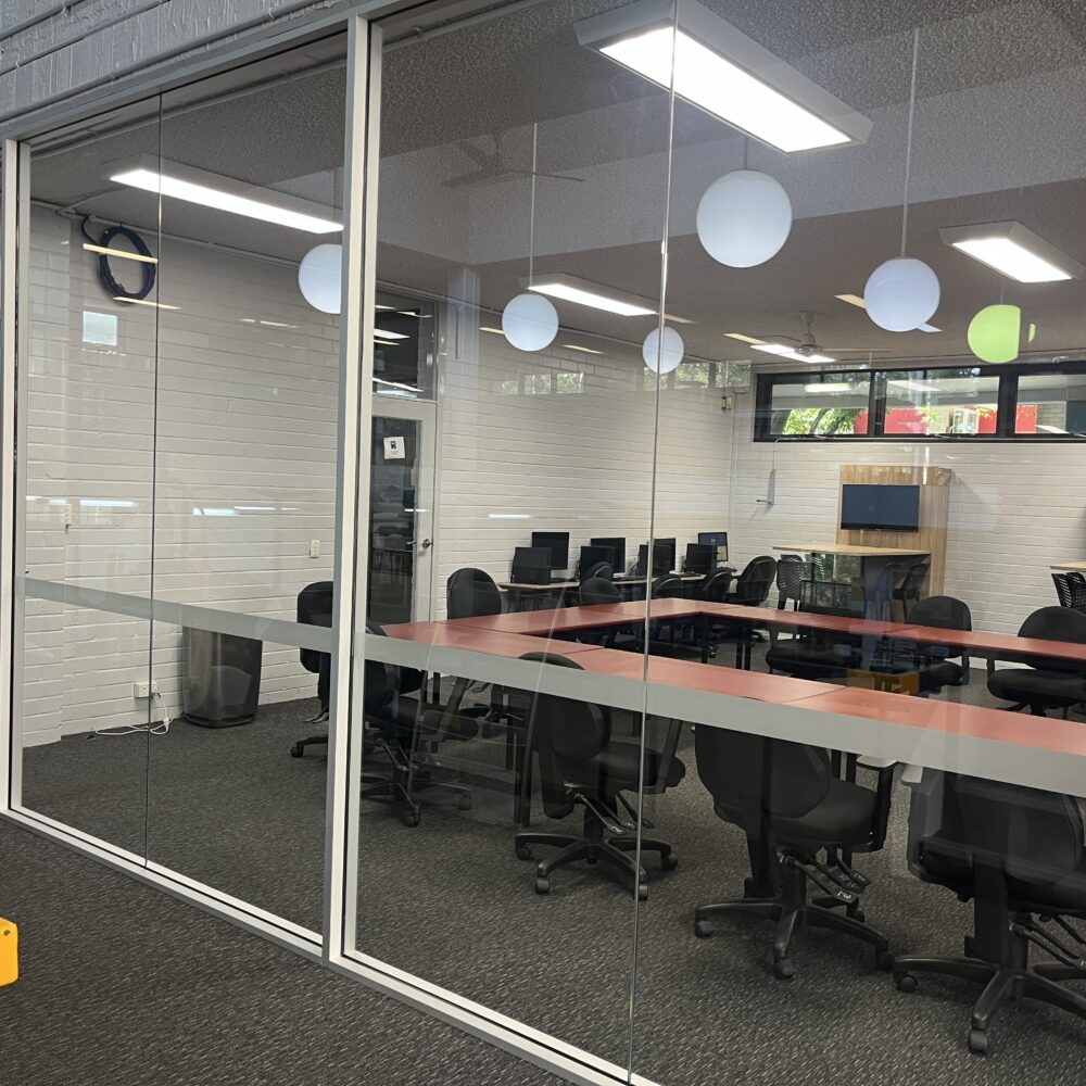 Installation of a full-height glazed partition wall completed for Moorebank High School, enhancing functionality within the library space.